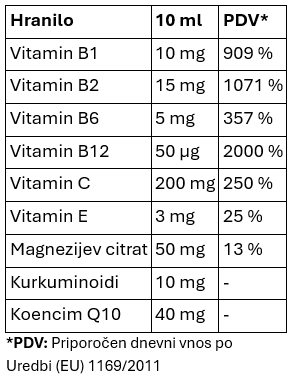 Sestavine: Prečiščena voda, glicerol, fosfolipidi, brezvodni magnezijev citrat, natrijev L-askorbat, citronska kislina monohidrat, riboflavin, tiamin klorid, ubikinon, kurkuminoidi, piridoksal-5-fosfat, antioksidanti: izvleček rožmarina, mešanica tokoferolov, izvleček rakitovca, metilkobalamin.