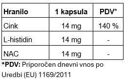 Sestavine:Inulin, cinkov glukonat, N-acetil-L-cistein (NAC), L-histidin, L-leucin, ovojnica kapsule: hidroksipropil metilceluloza