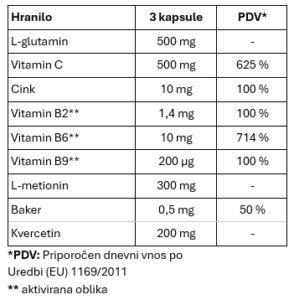 - z vitaminom C, cinkom, L-glutaminom, vitamini skupine B, bakrom in kvercetinom