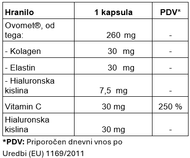 Sestavine: Ovomet® membranski prah iz jajčnih lupin (90 % beljakovin, 22 % kolagena, 25 % elastina, 3 % hialuronske kisline), magnezijev askorbat, hialuronska kislina, inulin, L-levcin, ovojnica kapsule: hidroksipropilmetilceluloza.