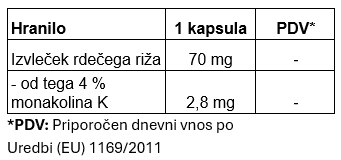 Sestavine: inulin, izvleček rdečega kvasnega riža (od tega 4 % monakolina K), L-levcin, ovojnica kapsule: hidroksipropilmetilceluloza.