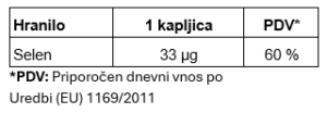 Naš tekoči selen vam v samo 3 kapljicah na dan zagotovi 99 µg anorganskega natrijevega selenita. Pri tem odmerku vam bo ena steklenička zadostovala za približno eno leto. Zaradi prijetno svežega okusa ga lahko enostavno zaužijete neposredno, idealna biološka uporabnost pa je dosežena, če ga zaužijete na tešče.
