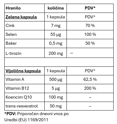 Aktivne sestavine v 1 odmerku (= 1 temno zelena in 1 vijolična kapsula):