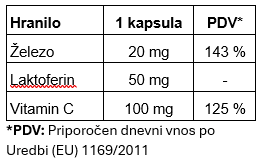 Sestavine: Železov bisglicinat, magnezijev askorbat (94 % vitamina C), inulin, laktoferin, L-leucin, kapsula: hidroksipropil metilceluloza.