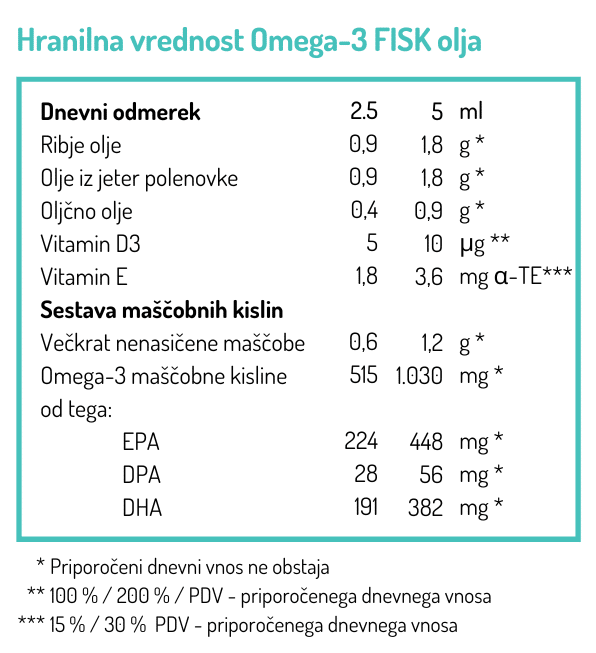 Omega-3 FISK (150 ml) je edinstvena kombinacija naravnega ribjega olja z visoko vsebnostjo EPA, olja iz jeter polenovke in ekstra deviškega oljčnega olja iz ekološkega kmetovanja (kot antioksidant). Vnos olja zagotavlja odmerek EPA in DHA Omega-3 maščobnih kislin.